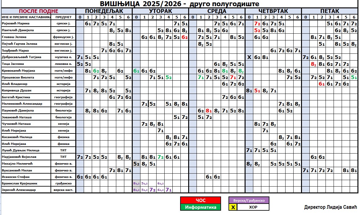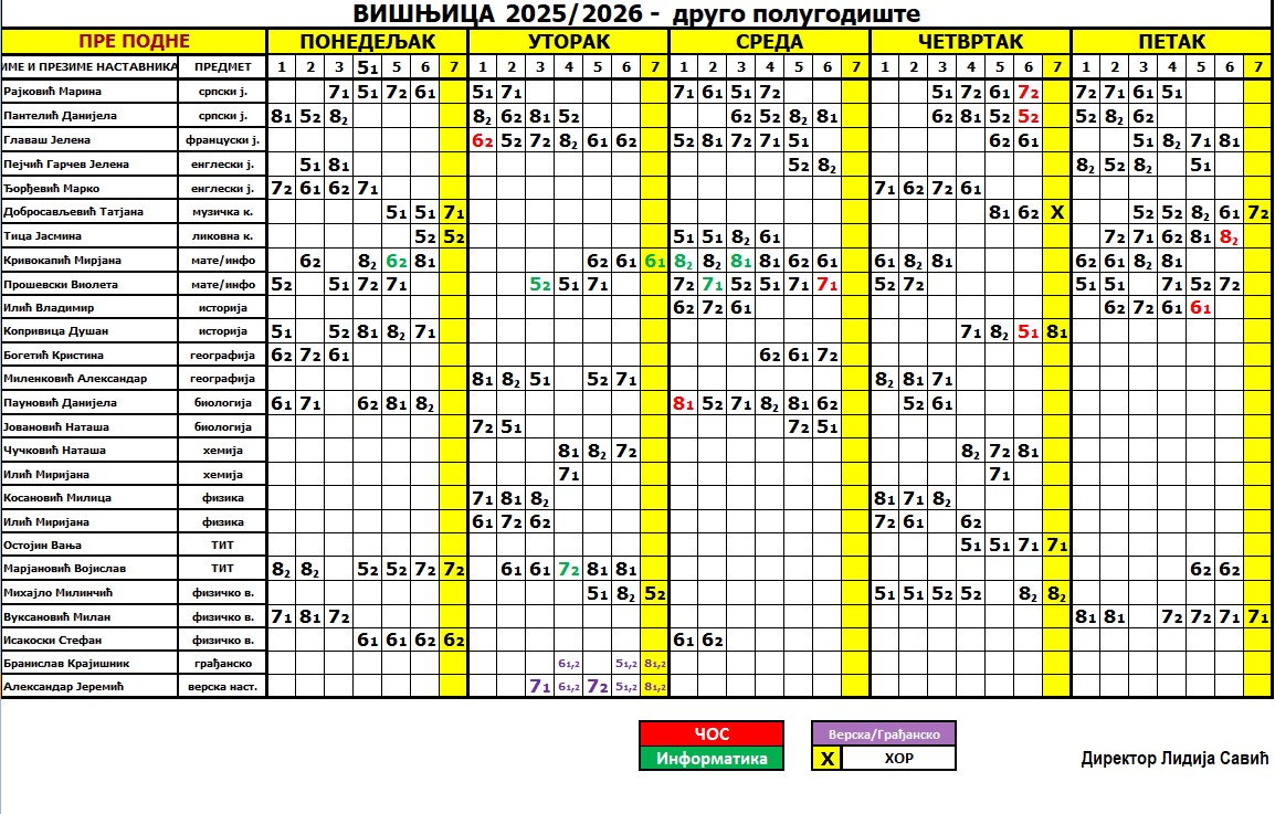 Настава је у школској 2025/2026. години  организована у две смене које се недељно мењају, а почев од прве недеље у септембру смене су следеће: