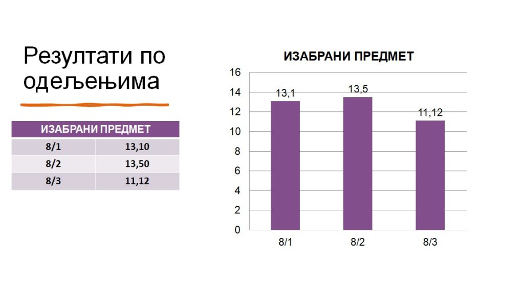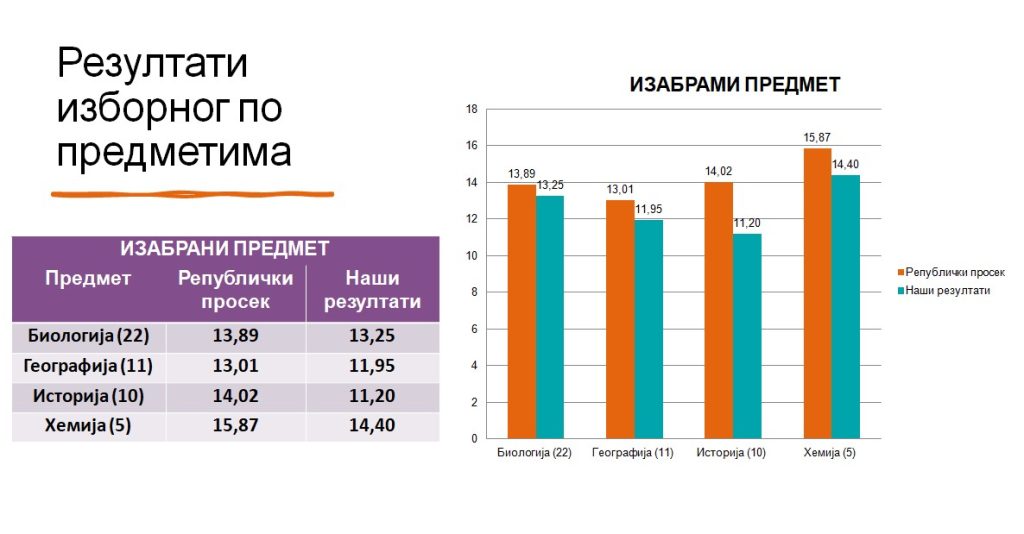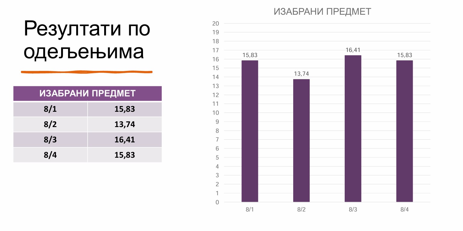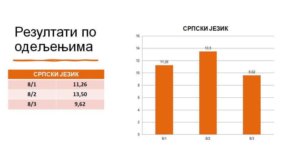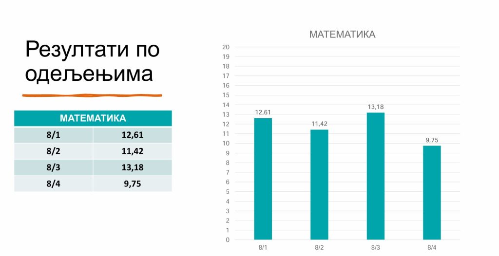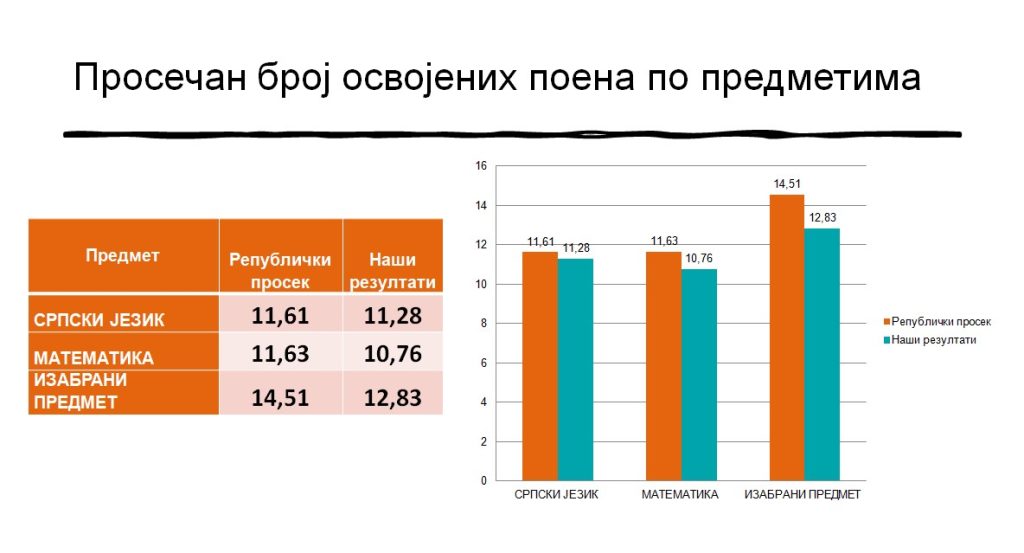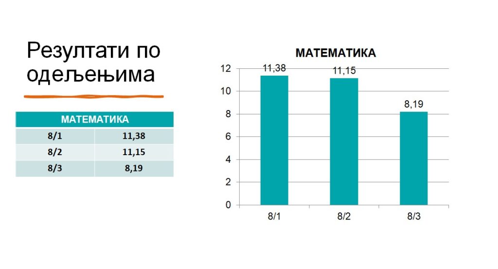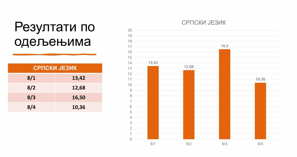 Просечан број бодова остварених на тесту из математике је 11,07. Просечан број бодова на тесту из српског језика је 12,69. Највећи просечан број бодова ученици су оставрили на комбинованом тесту 12,95 (слика 1). По одељењима највећи просечан број бодова на тесту из математике остварило је одељење 8-1 и то 12, 20 (11,31 на пробном); затим одељење 8-2 11,33 (11,27 на пробном) и одељење 8-3 9,46 (10,13 на пробном) (слика 3). По одељењима највећи просечан број бодова на тесту из српског језика остварило је одељење 8-2 13,50 (14,8 на пробном); затим одељење 8-1 12,47 (12,96 на пробном) и одељење 8-3 12,00 (12,04 на пробном) (слика 2). По одељењима највећи просечан број бодова на тесту из комбинованог теста остварило је одељење 8-2 13,83 (13,77 на пробном), затим одељење 8-1 13,10  (13,42 на пробном) и одељење 8-3 11,87 (12,79 на пробном) (слика 4). Просечан број бодова са сва три теста заједно по одељењу: