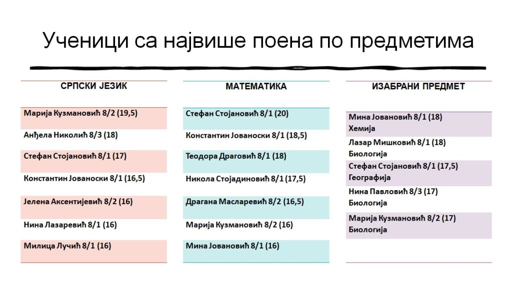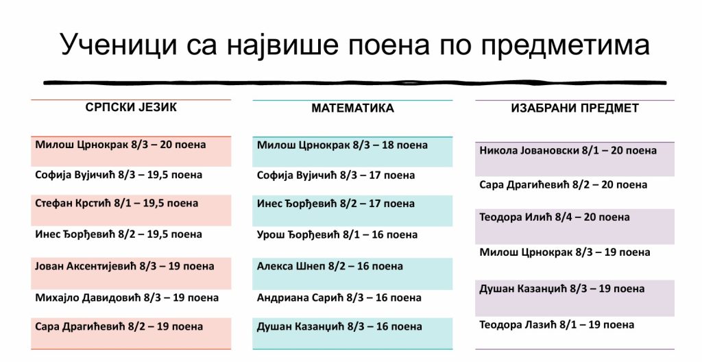 • 19 бодова – Сара Ђорђевић и Душан Миљковић 8/1 и Михаило Марковић 8/2