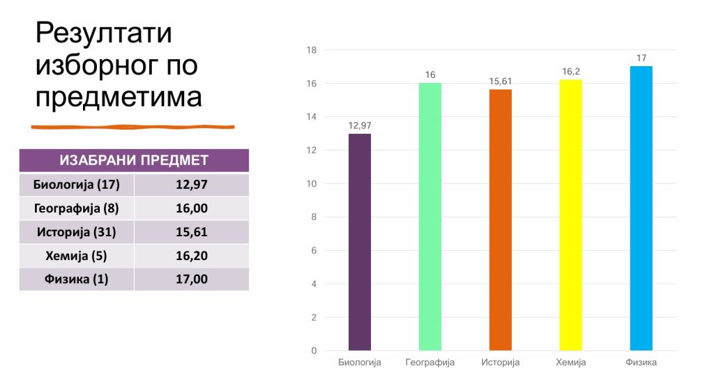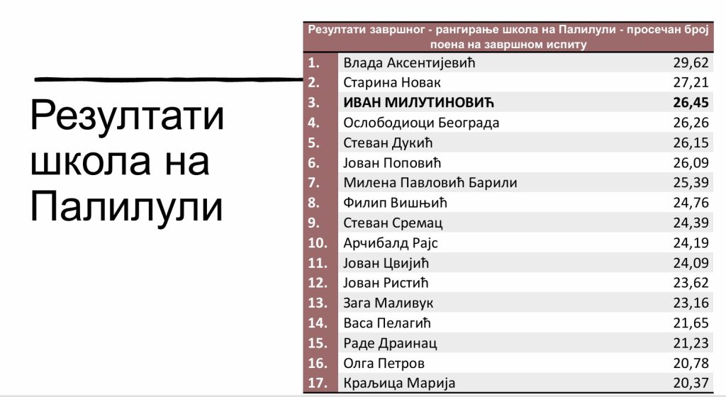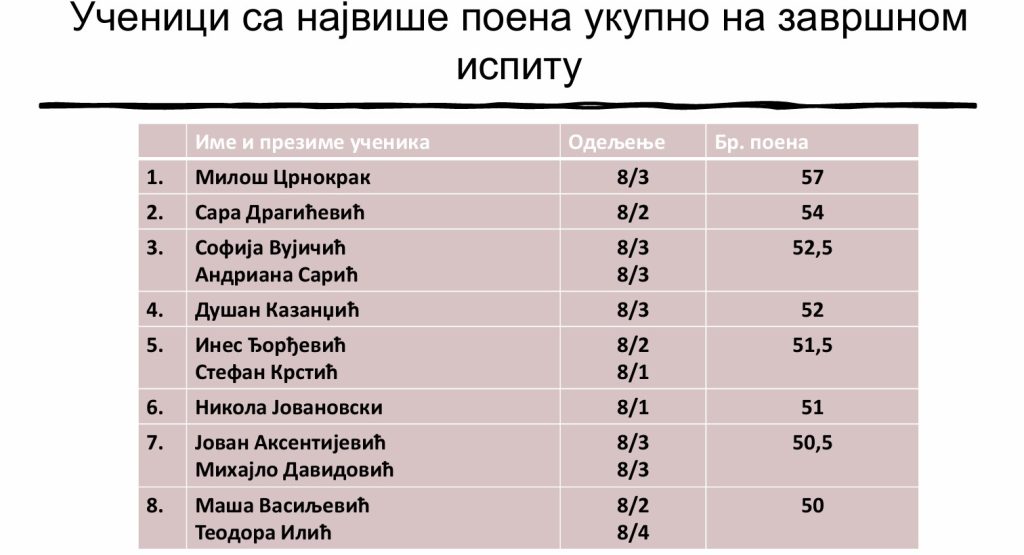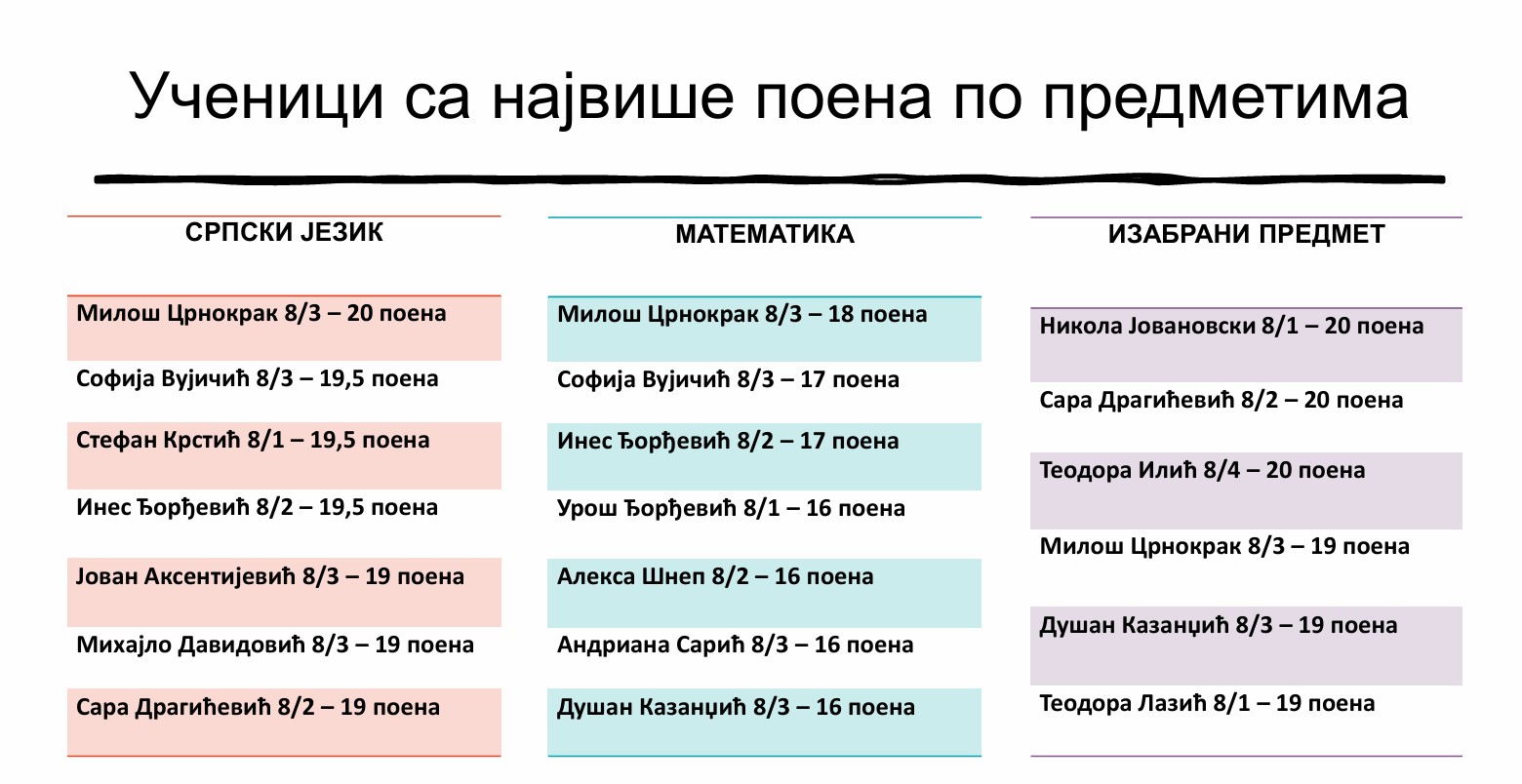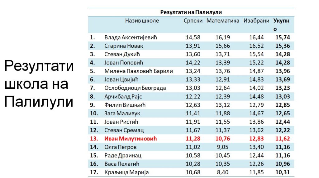 По тестовима: српски језик 7. место, математика 12. место, комбиновани тест 5. место
